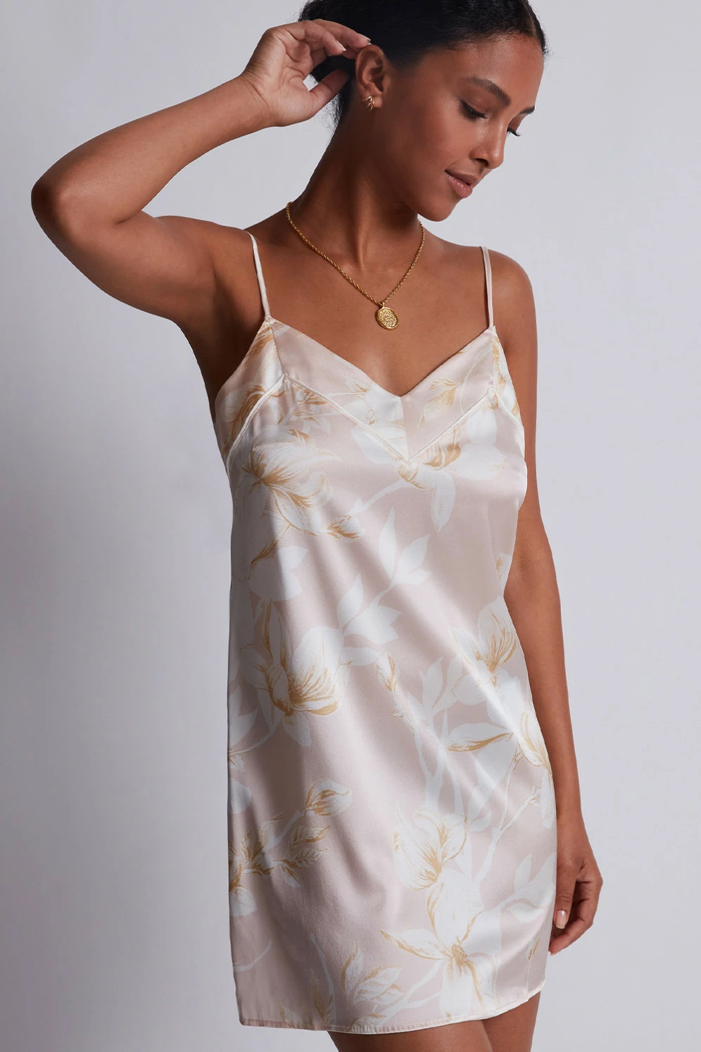 Aufregend gestaltetes Kleidchen aus kostbarer Seide mit Stretchanteil – für ein völlig unbeschwertes Bewegungsgefühl. Raffinierte Details sind der V-Ausschnitt mit breiter Blende und Paspelierung sowie goldfarbene Ringe und Schieberegler an den verstellbaren Spaghettiträgern. Wundervoll fließt das Material entlang des Körpers. Der großblumige moderne Print zeigt sich Ton in Ton und untermalt einen lichten, sommerlichen Auftritt. Mit seinem schwindelerregenden Rückenausschnitt bis zum Poansatz bietet dieses Modell Verführung pur.