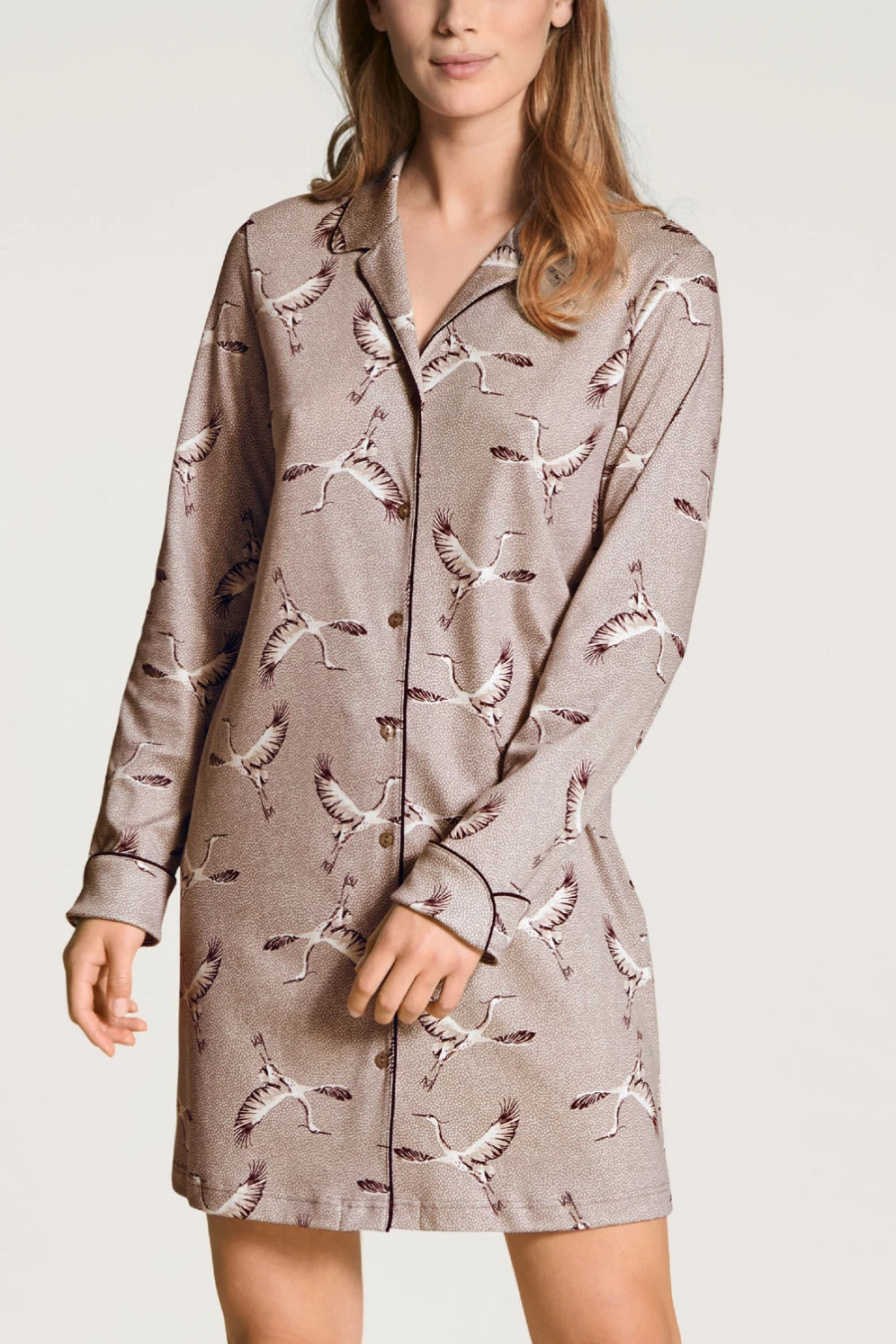 Calida-Nightshirt – vorn zum Durchknöpfen, mit klassischer Kragenvariante und Paspelierungen, besonders hübsch gestaltet an den Ärmelaufschlägen. Feinste Baumwollqualität nach Schweizer Standards verspricht ein super weiches und höchst angenehmes Tragegefühl an der Haut. Die edlen Knöpfe mit Markenprägung und das originelle Dessin mit Kranichen macht das klassisch geschnittene Modell zu etwas Besonderem: So geht es auf Schwingen in nächtliche Traumwelten.