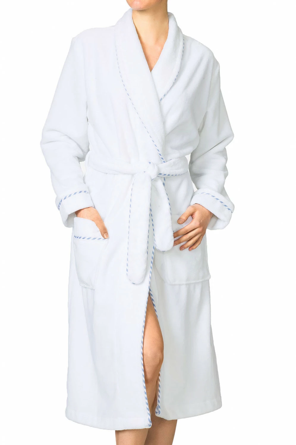 Kuschelig weicher Bademantel aus schnelltrocknendem Polyestervelour mit Frottee-Innenseite aus Baumwolle – extra saugstark, superleicht und wunderbar flauschig. Betont wird das klassisch elegante Design durch dezente, blau-weiß geringelte Paspeln an Ärmel, Taschen, Bindegürtel und Schalkragen. Der hochwertige Damenbademantel begleitet Sie in allen Lebenslagen und garantiert besten Tragekomfort.