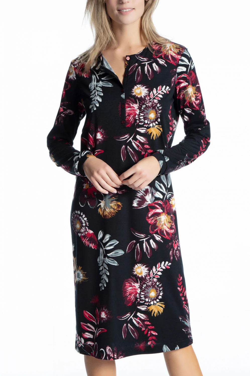 Bequemes, klassisch geschnittenes Nachtdress mit langen Ärmeln. Ein runder Halsausschnitt weist zusätzlich eine solide gearbeitete schmale Knopfleiste auf, die das Überziehen des Modells ganz einfach werden lässt. An den Handgelenken sind kleine Bündchen angesetzt. Der untere gerade Abschluss des körpernahen Modells ist mit Zwillingsnähten gesäumt. Mit seinem Fantasie-Blumenprint auf dunklem Grund erobert es die Herzen. Der weiche Baumwollstoff schmeichelt der Haut.