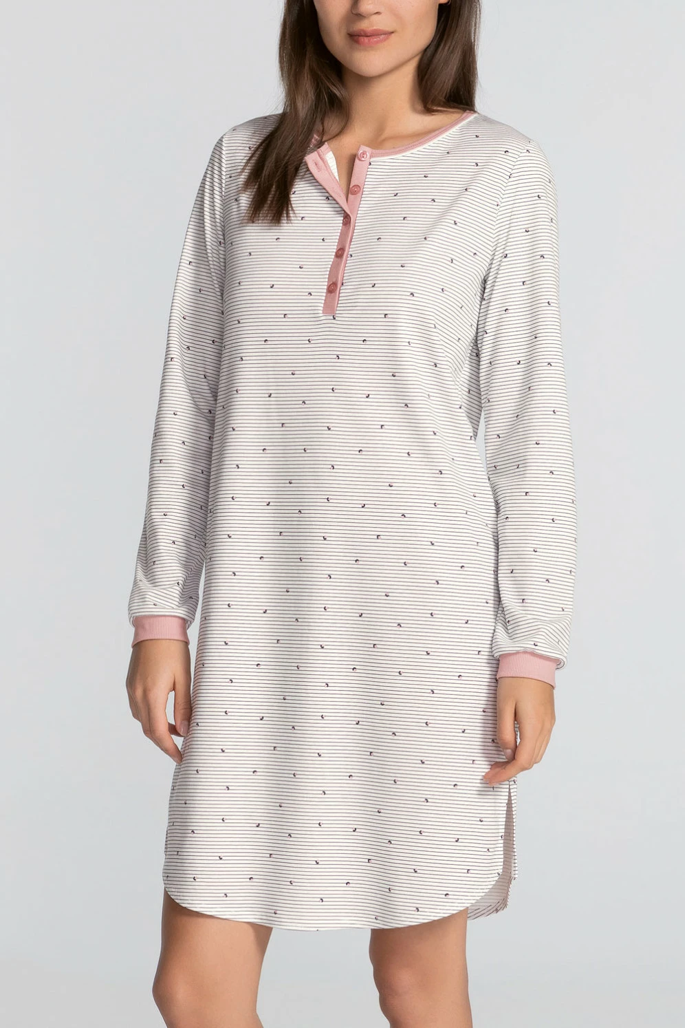 Klassisch geschnittenes Schlafshirt mit schönen langen Ärmeln. Die kleinen Bündchen umschließen sanft die Handgelenke. Ein bequem weiter Rundhalsausschnitt und eine lange Knopfleiste machen das Hineinschlüpfen leicht und verzieren das Modell, das leger bis zur Oberschenkelmitte fällt. Hübscher Bogensaum mit seitlichen Schlitzen gibt genügend Bewegungsfreiheit für die Nacht. Die hohe Qualität des Interlock-Jerseys ist auf der Haut zu spüren. Das feine feminine Dessin zeigt Röschen auf Nadelstreifen.