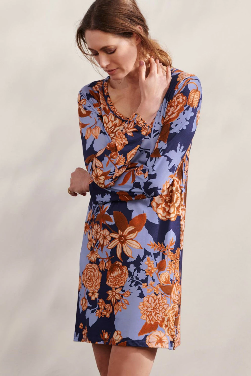 Nachthemd mit langen Ärmeln und weitem Ausschnitt, der sanft v-förmig geschwungen das Dekolleté rahmt. Auf seine Einfassung mit betonender Paspel ist besonders Wert gelegt. Der wunderschön fließende Viskosestoff zeigt große Blüten auf komplementärem Grund. Die Säume sind mit Zwillingsnähten gesteppt. Dieses Nachthemd bietet einen komfortablen Schnitt und reicht bis zur Mitte der Oberschenkel.