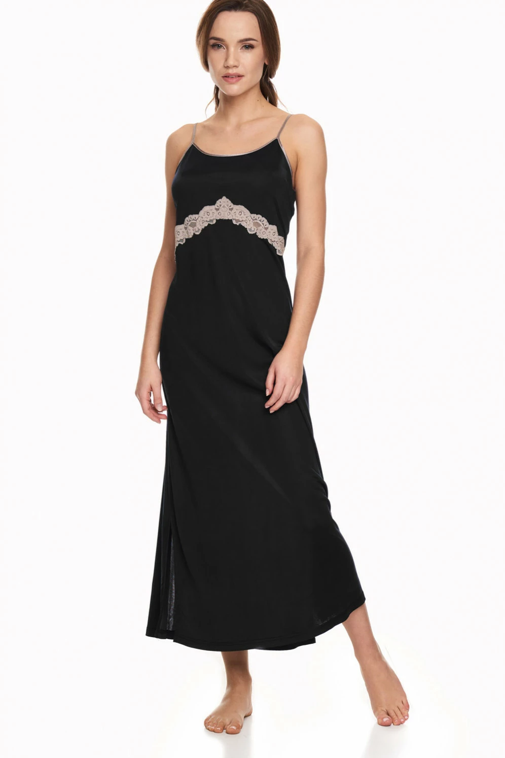 Das lange Spaghettiträger-Nachthemd aus der Kollektion Amy von Gattina umspielt charmant die Silhouette. Feinste Viskose, in wohlgefälliger Symbiose mit Seide zeigt sich seidig-glatt und mit fließendem Fall für perfekten Komfort und eine exklusive Optik. Etwas unterhalb des Dekolletés, veredelt ein weiches Spitzenband, in Kontrastfarbe oder Ton in Ton, das feminine Modell. Die zierlichen Träger sind in der Länge verstellbar.