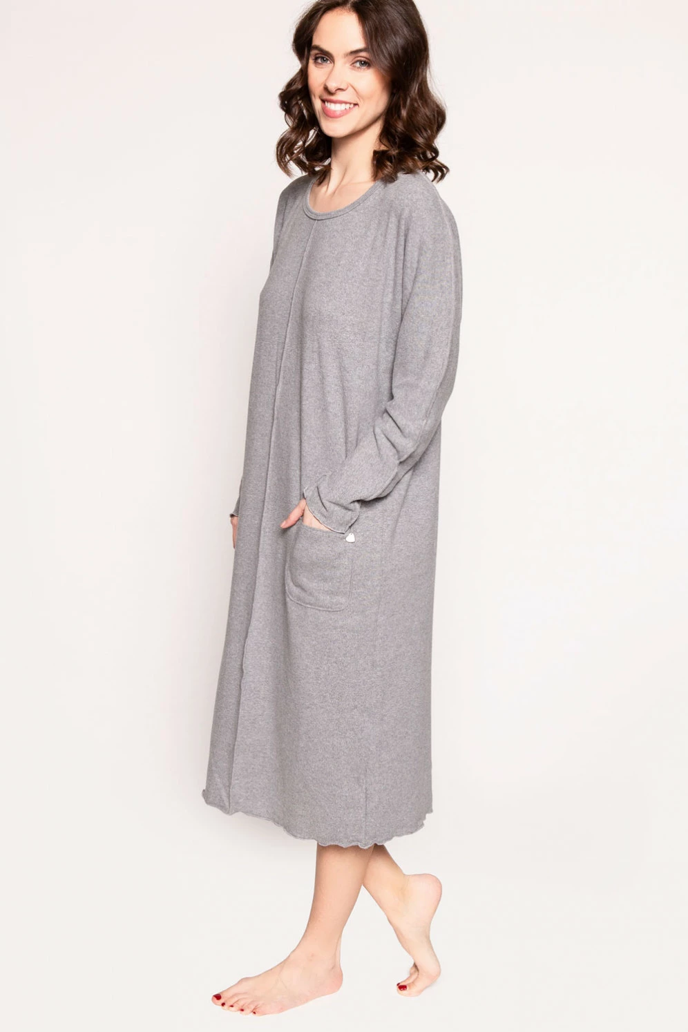 Figurumspielendes Nachthemd aus einer kuschelweichen Materialqualität zum Wohlfühlen. Der angeraute, fließend fallende Feinstrick besteht zu 70 Prozent aus Baumwolle und ist dadurch besonders angenehm und hautsympathisch. Das knielange Modell hat lange Ärmel und einen runden Halsausschnitt, verspielte Wellensaum-Abschlüsse verleihen den femininen Touch. Eine große Tasche auf Taillenhöhe bietet Platz für das Taschentuch oder andere Kleinigkeiten. Die Vorderseite hat in der Mitte eine senkrechte Paspel. Made in Germany.