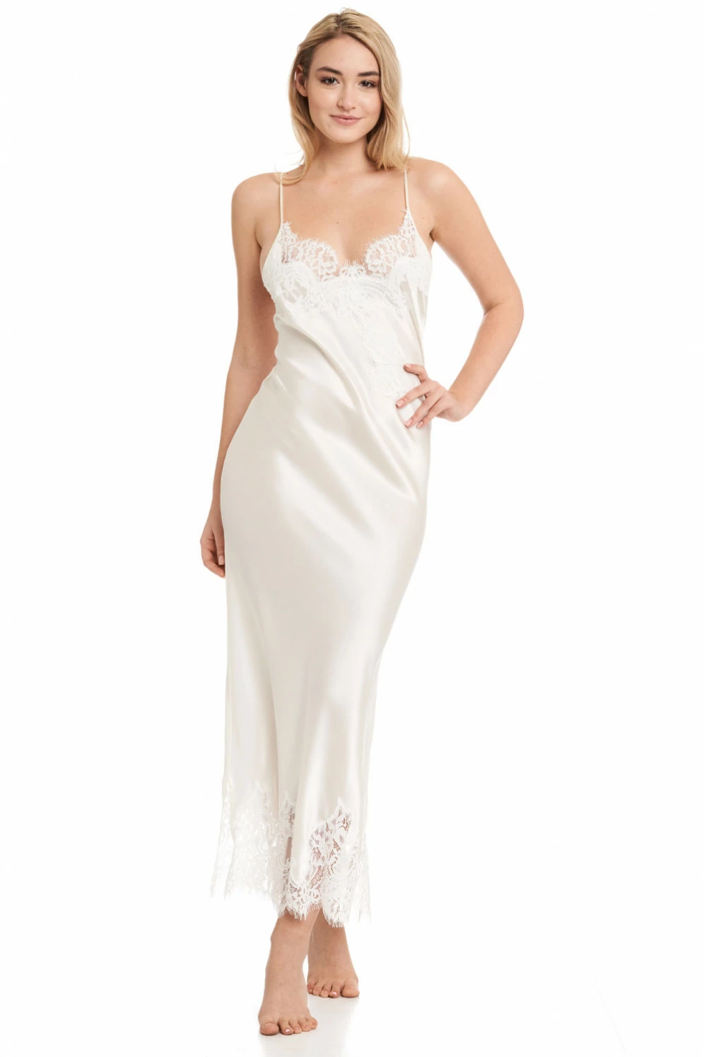 Edles langes Nighty aus purer Seide mit Elasthanbeigabe, aufwendig besetzt mit großen Spitzenpartien. Deren Blumen und Fantasiegebilde zeichnen sich sowohl über der Haut als auch dem Stoff deutlich ab. Sie schmücken den weiblichen Körper damit optisch wie haptisch und enden an Dekolleté und unterem Abschluss mit langen Wimpern. Das extravagante Kleid endet in Höhe der Fußknöchel mit transparenten Partien und Seitenschlitz. Zarteste, verstellbare Spaghettiträger werden leicht konisch über den oberen Rücken geführt. Sie ergänzen den dort kreierten höchst ästhetischen Ausschnitt mit dem weiträumigen Spitzeneinsatz.
