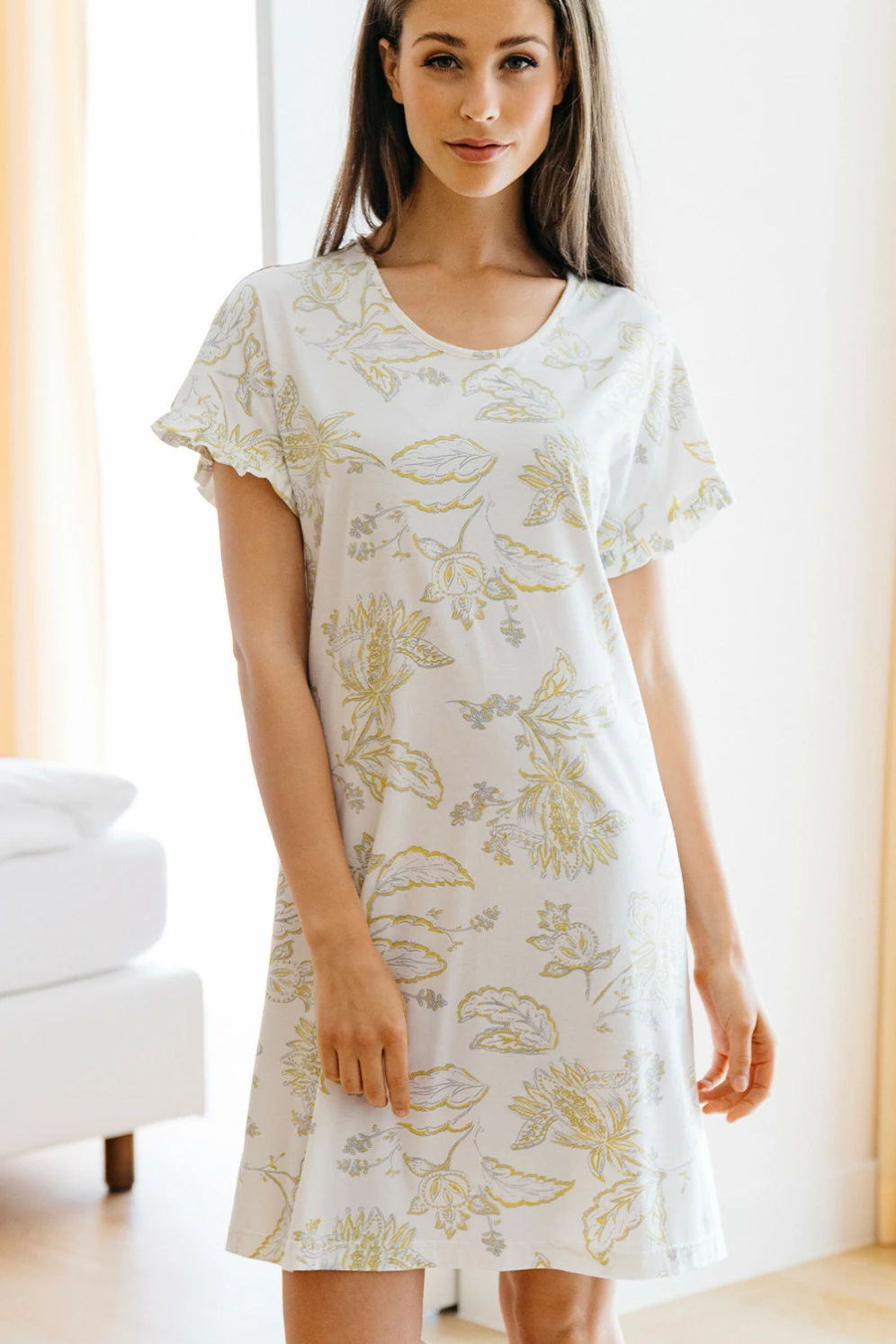 Kurzes Nachtkleid von Hutschreuther Classic, dessen sanftes florales Dessin und helle Farbgebung ideal für die Sommernacht sind. Dank des bequemen Schnitts mit weit überzogenen Schultern kann auf konturierende Nähte verzichtet werden. Die entstehenden kurzen Ärmel sind verspielt mit Rüschen aus dem gleichen Stoff geschmückt. Der feminin runde Ausschnitt ermöglicht ein vollkommen unkompliziertes Überziehen. Das Modell aus feinem Baumwoll-Modal-Gewebe bietet komfortables Wohlbefinden.