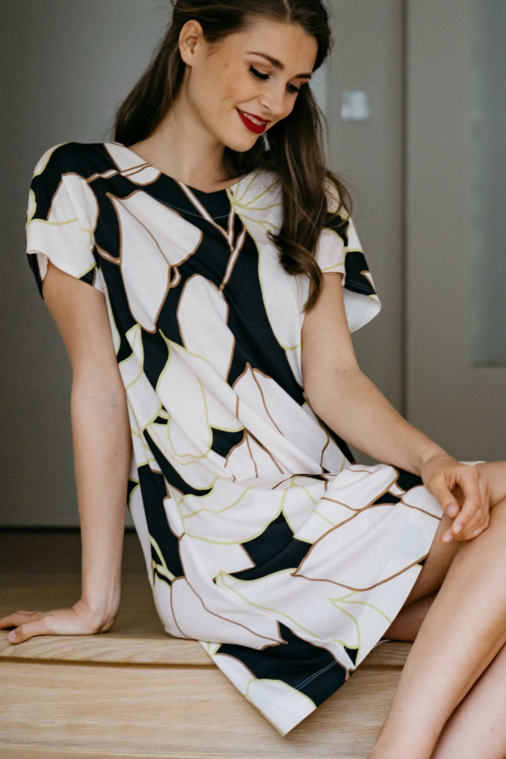Elegantes Nachtkleid, das sich dank des feinen weichen Stoffes wunderbar an der Haut anfühlt. Es ist insgesamt leger gestaltet, die Schultern sind für kurze Ärmel überschnitten, die bequeme Weite setzt sich bis zum Saum fort. Besonders gefällig ist der Ausschnitt gearbeitet: Mit einer leicht angedeuteten Spitze, der dekorativ wirkenden Einzelnaht und der Öffnungsgröße sind sowohl das Überziehen als auch das Anliegen geradezu ideal. Das große kontrastreiche Muster wirkt kunstvoll.
