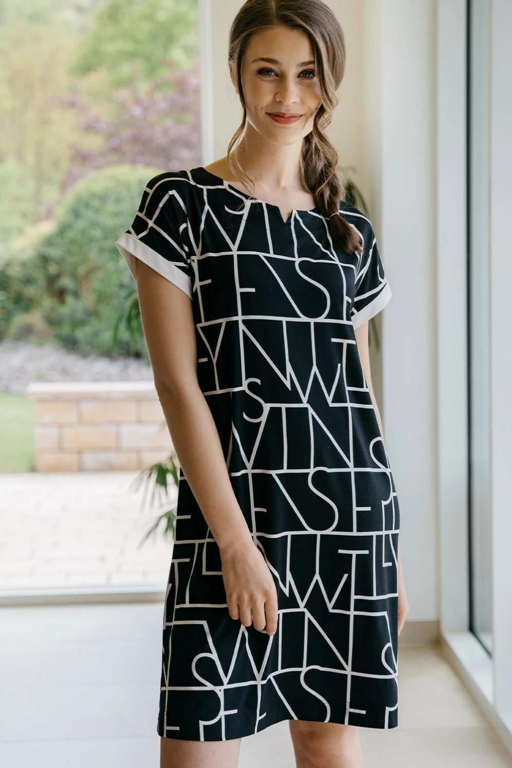 Schöner Stoff aus Viskose mit Elasthananteil und ein simpler, bequemer und weiblicher Schnitt zeichnen dieses legere Kleidchen aus. Durch die überschnittenen Schultern entstehen hübsche kurze Ärmel, die mit breitem Rand abgesetzt sind. Darüber hinaus gibt es legere Weite für den Brustbereich – nichts engt ein. Der Halsausschnitt verläuft weit und rund, er zeigt mittig eine kleine v-förmige Vertiefung als Blickfang-Detail. Das moderne Dessin aus großen Buchstaben in Kontrastfarbe bildet ein All-over-Muster. In Kombiniation mit einer Leggings ist das der perfekte Freizeitlook.