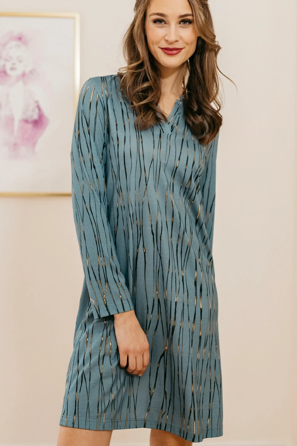 Angenehm weiches Material bietet bei diesem Nachtkleid beste Voraussetzungen für eine effektive Erholungsphase. Das Modell hat einen bequemen Schnitt mit klassisch angesetzten langen Ärmeln. Die Säume sind mit Zwillingsnähten gesichert. Ein hübsch gestalteter v-förmiger Ausschnitt mit Andeutung eines Kragens sieht nicht nur ansprechend aus, sondern erleichtert auch das Überstreifen. Das besondere Dessin vermittelt Eleganz: vertikale schwarz-goldene Linien auf matt blaugrünem Grund.