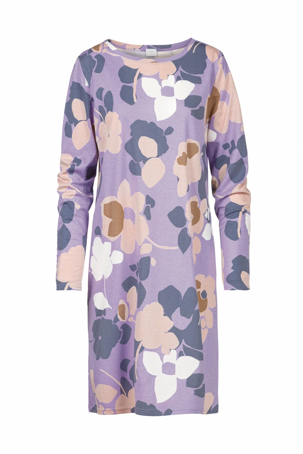 Leger geschnittenes Damen-Nachthemd von Mey mit abstraktem Floralmuster auf fliederfarbenem Untergrund. Zum Träumen schön! Die extraweiche Interlockqualität aus reiner Baumwolle sorgt für ein spürbar gutes Gefühl auf der Haut und ist äußerst langlebig. Das Modell ist etwa 94 cm lang, hat ein schmale Paspelierung am Rundhalsausschnitt und lange Ärmel.