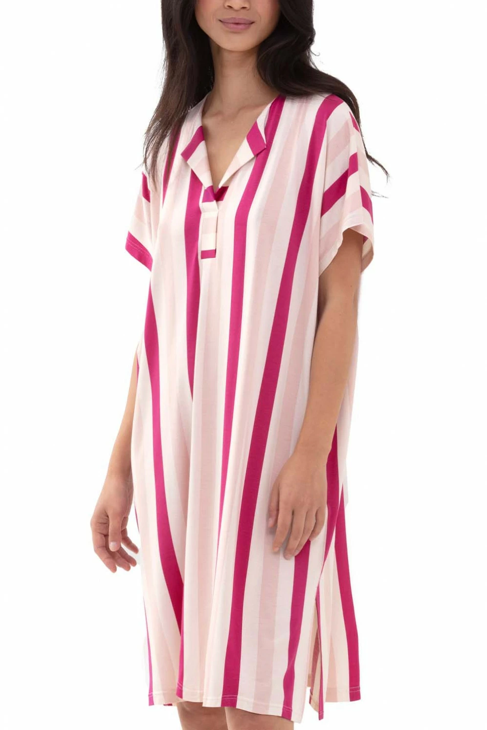 Kurzärmeliges Nachthemd in fabelhaft feiner Materialqualität. Die legere Form mit den überschnittenen Schultern erzeugt Volumen für den Körper, das gerade für den Schlaf wichtig ist. Ein offen gestalteter Ausschnitt mit umfallenden Ecken ergibt ein hübsches Detail und erleichtert das Überstreifen. Ärmel und Saum haben Doppelnähte. Das Modell erscheint schlank durch vorteilhafte Längsstreifen, der Modalstoff glänzt elegant.