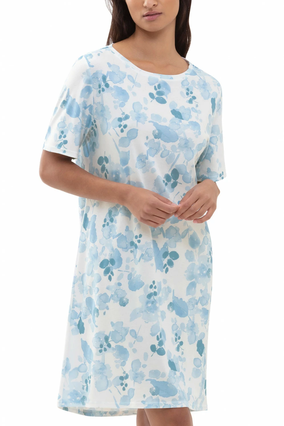 Das Nachthemd mit kurzen Armen benötigt wegen des geraden Schnitts keine weiteren Nähte, die Ärmel sind klassisch angesetzt. Ein runder Halsausschnitt zeigt sich sorgfältig gearbeitet, Säume sind mit Doppelnaht gesichert. Mit 94 cm und leicht verlängertem Rücken verfügt das Modell über eine angenehme Länge, dazu kommt die bequeme Weite am Körper. Ein wunderbar pastelliges Allover-Muster wirkt besänftigend – gerade richtig für einen gesunden Schlaf.