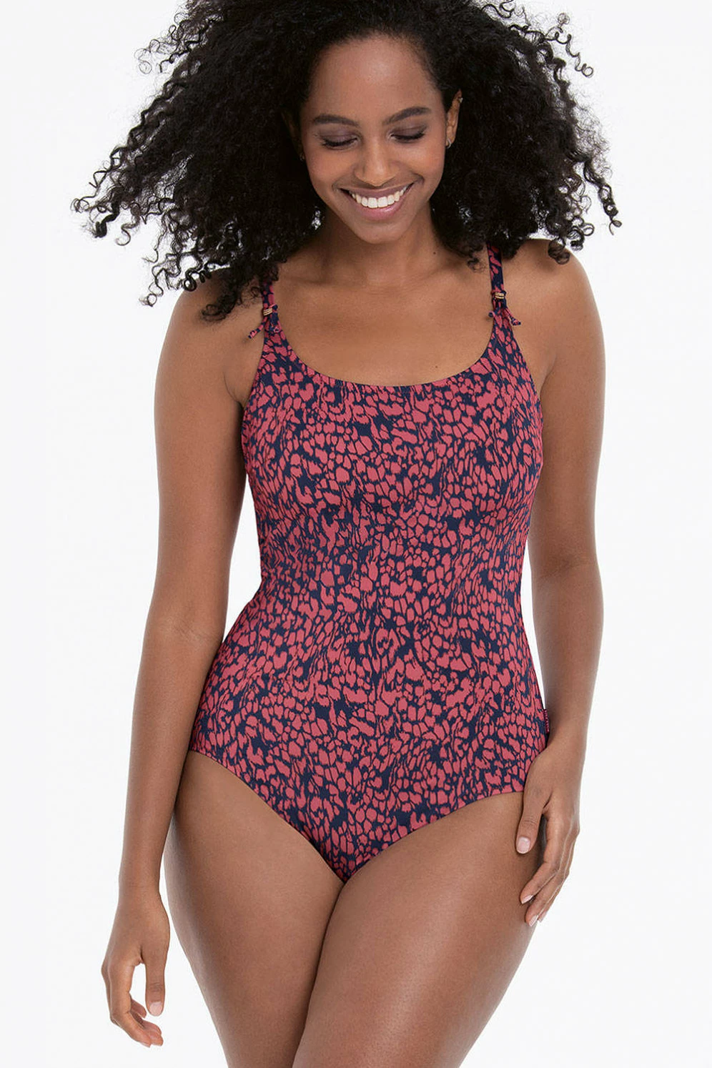 Wunderschöner Badeanzug mit filigranen Zierden an den Trägeransätzen und weitem u-förmigem Ausschnitt. Innen liegende Bügel gewähren konturierenden Halt und sichern eine attraktive Silhouette. Die schmalen Träger verlaufen parallel über die Schultern und sind hinten verstellbar. Eine runde Rückenöffnung und etwas höhere Beinränder lassen einen hübschen Anblick entstehen. Die Abschlüsse sind mittels kleiner Zickzacknähte versäumt, Farben und Muster bieten einen interessanten Blickfang.